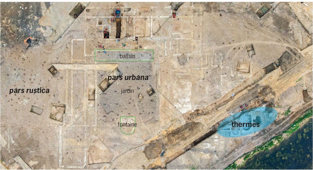 The pars urbana of the villa was organised around a 450 m² garden framed by a rectangular basin to the north and a small fountain to south, and surrounded by porticoes opening onto reception rooms and other spaces. Part of the pars rustica was brought to light to the west.
