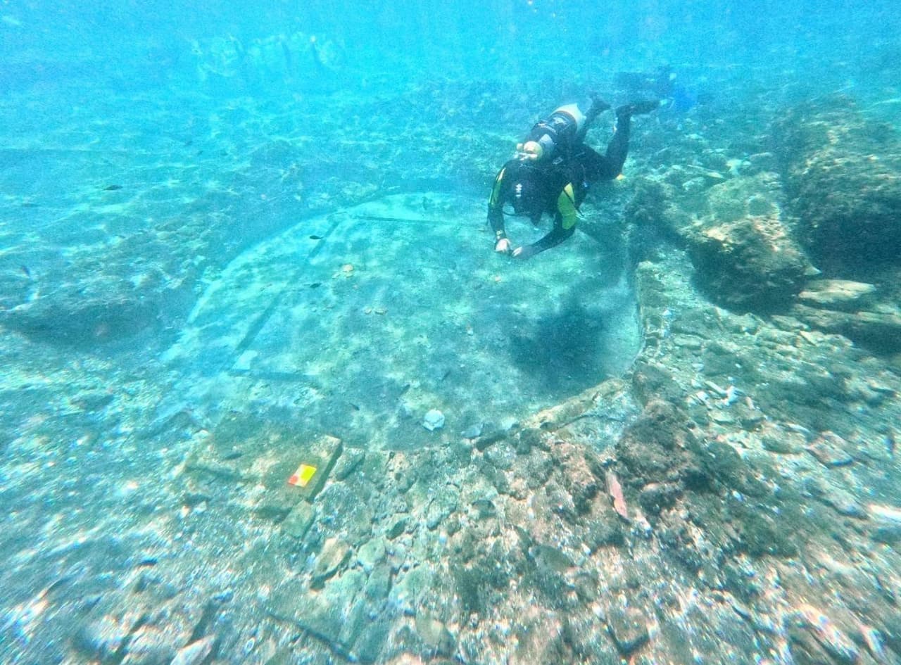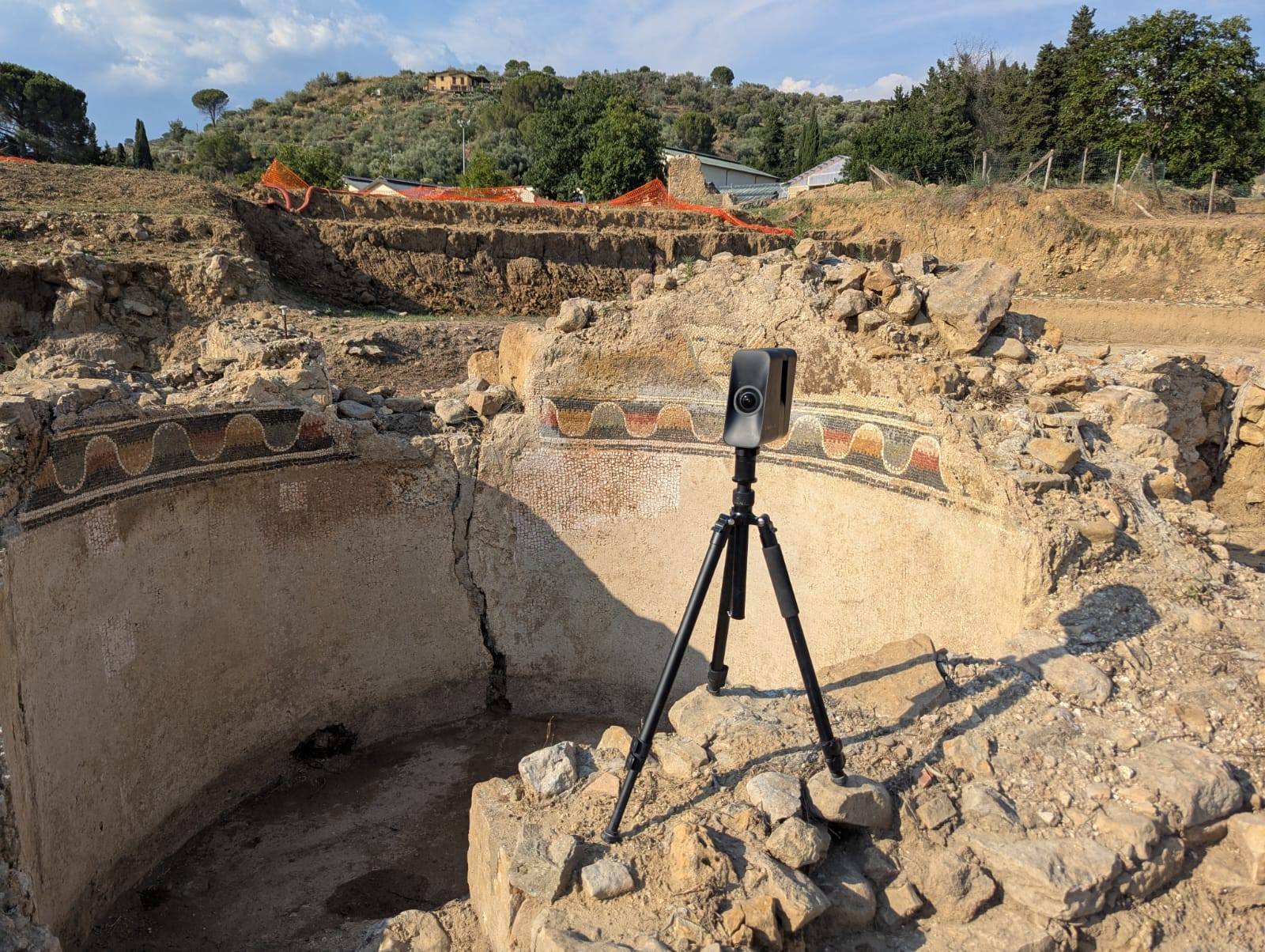 Finally, the Villa del Casale, the large 4rd c. AD villa near Piazza Armerina in southeastern Sicily, has provided us with another fine mosaic. Excavations of the Southern Baths of the villa have brought to light a mosaic depicting a pair of sandals, next to a field of polychrome squares and a text in white letters on red background (unpublished so far). Nearby discoveries include a basin with a polychrome mosaic border and three marble columns with capitals. Sandals are an iconographic model already known through examples from North Africa, for instance at Timgad and Sabratha—both of which were accompanied by a text wishing the customers a good bath. To know more about the discovery, you can read more here and here.