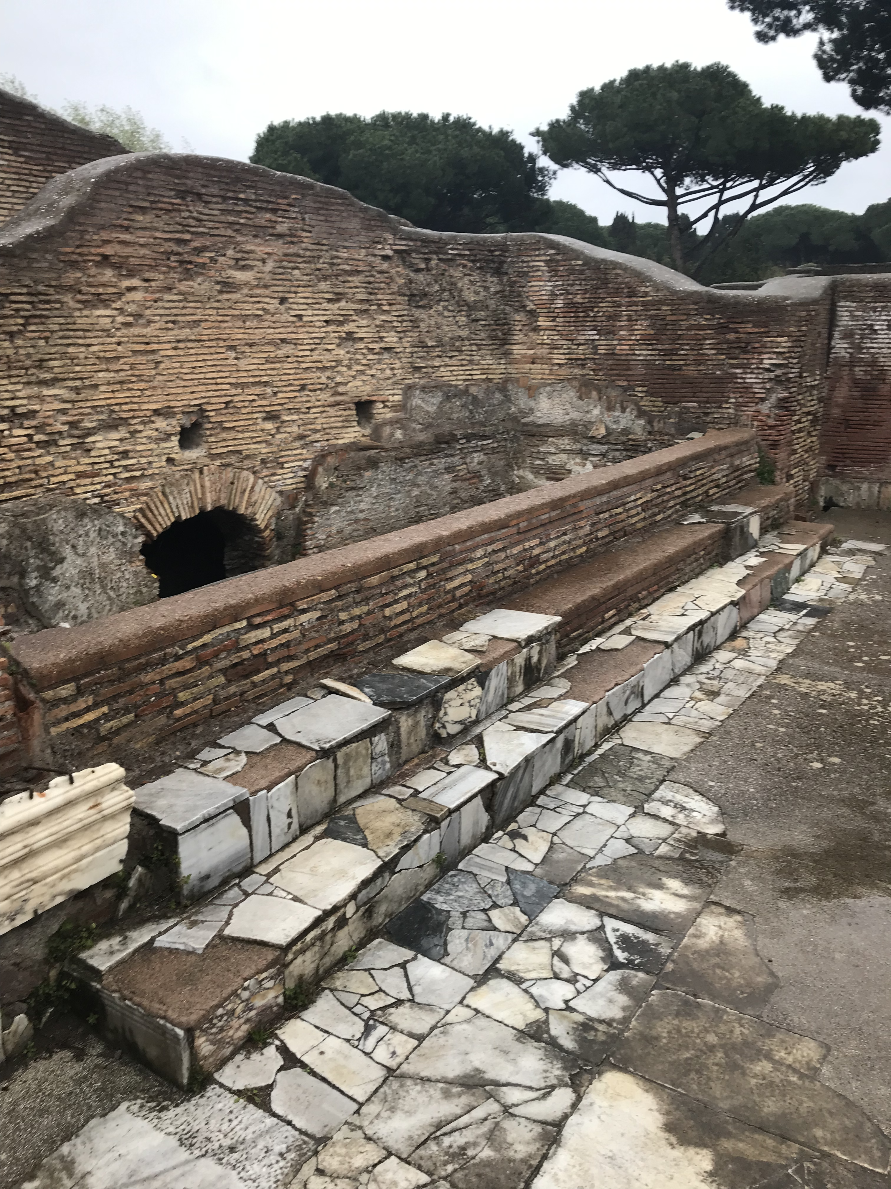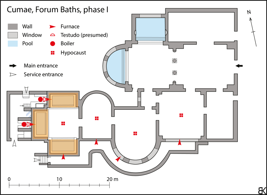 One of the alvei of the caldarium of the Forum Baths of Ostia (room H on this plan). Note the two small square openings in the back wall, presumably for the water supply to the pool, and the larger one underneath for the furnace and probably a testudo alvei (photo Allison Smith).