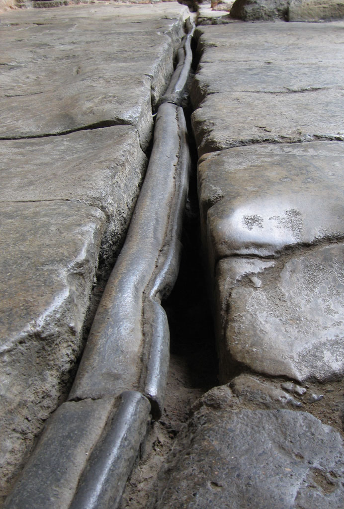 L: A lead fistula in situ in the baths at Bath, UK. Note the fold on the right hand side of the pipe (Photo Andrew Dunn, Wikimedia Commons; CC BY SA 2.0).