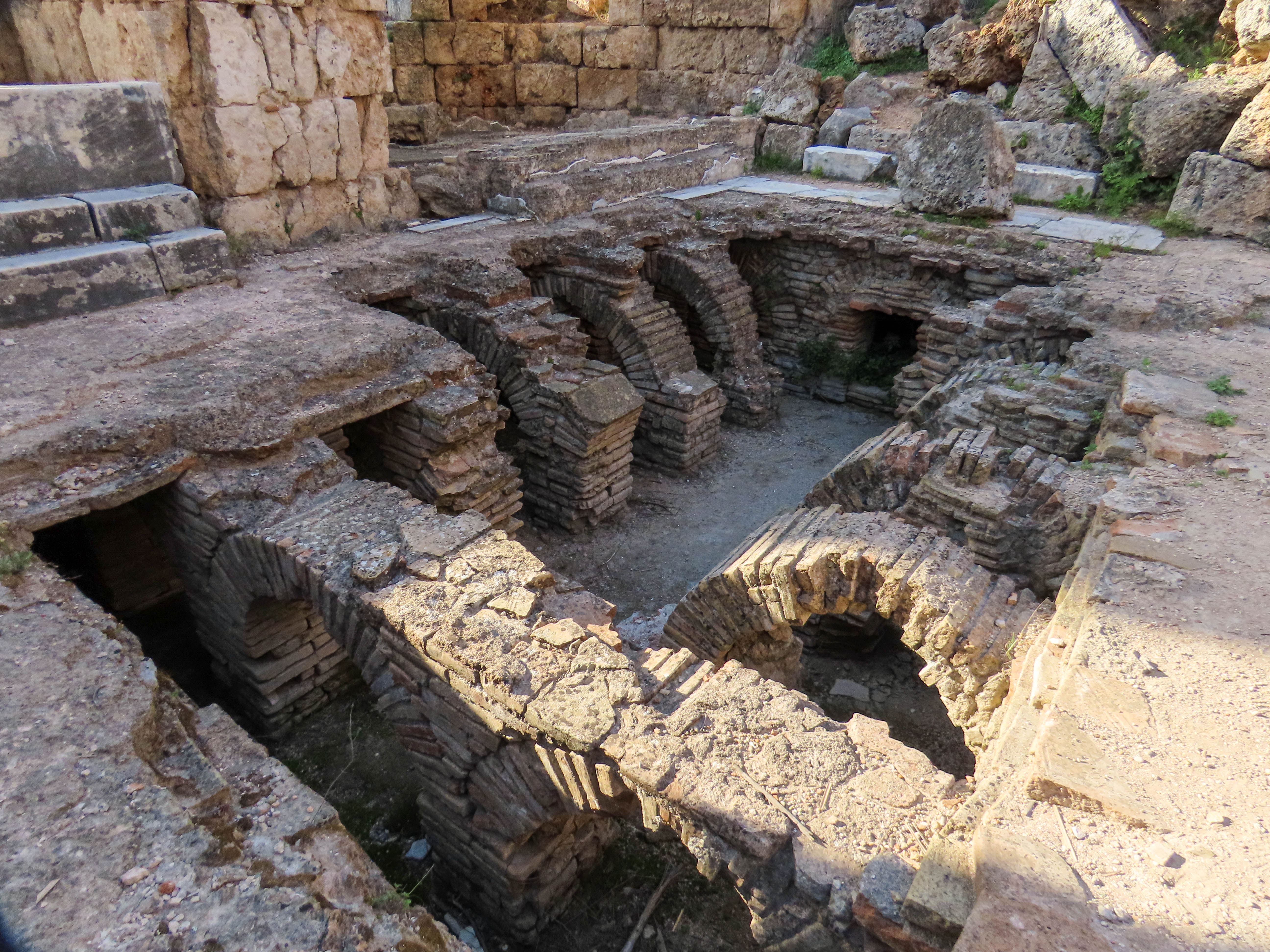 R: The hypocaust in the caldarium of the South Gate Baths in Perge, Turkey. The suspensura rests on brick arches rather than on the more common square pilae (photo Konogan Beaufay).