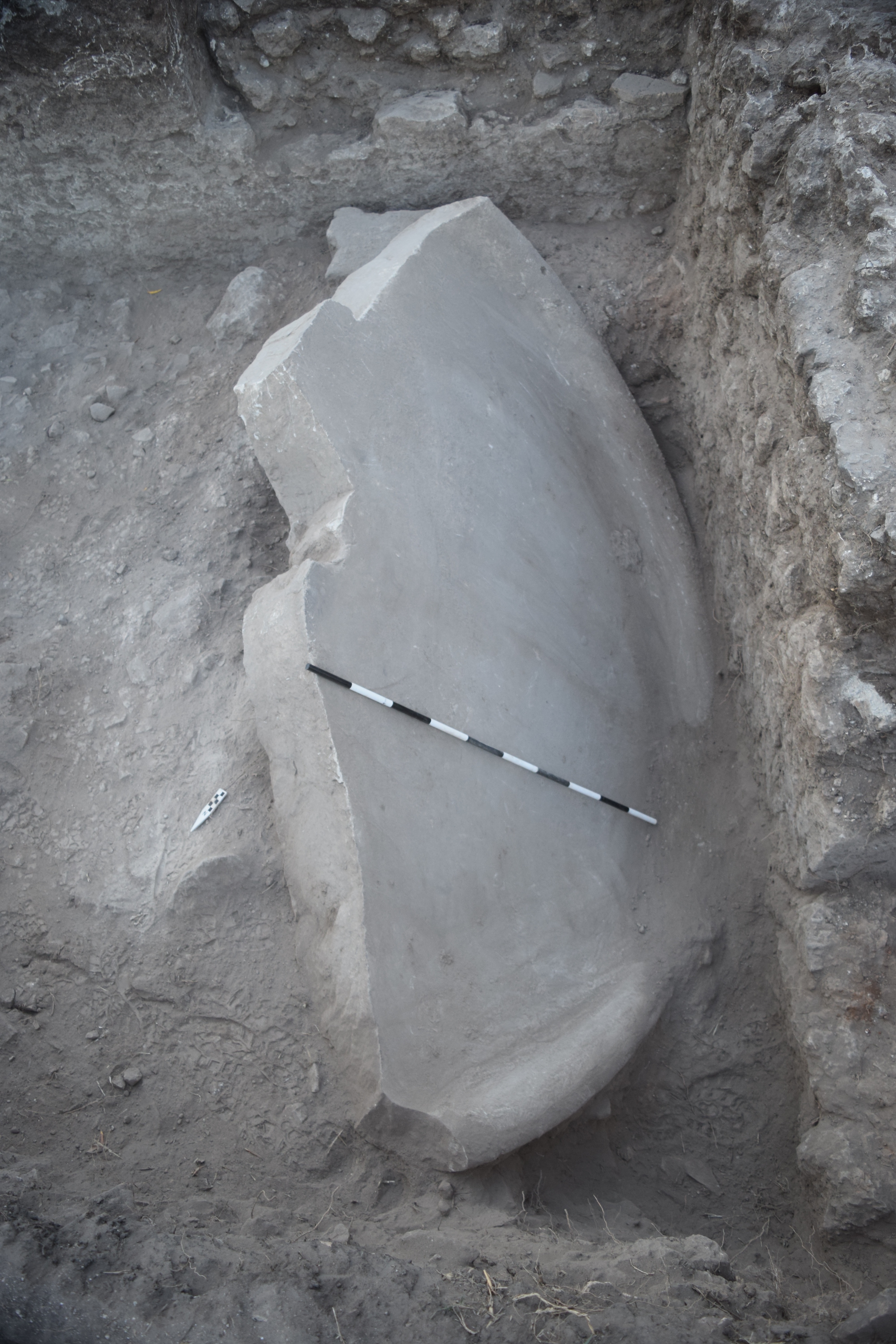 L: fragment of a labrum found in situ during the excavations of the baths of Cosa (Allison Smith/Cosa excavations).