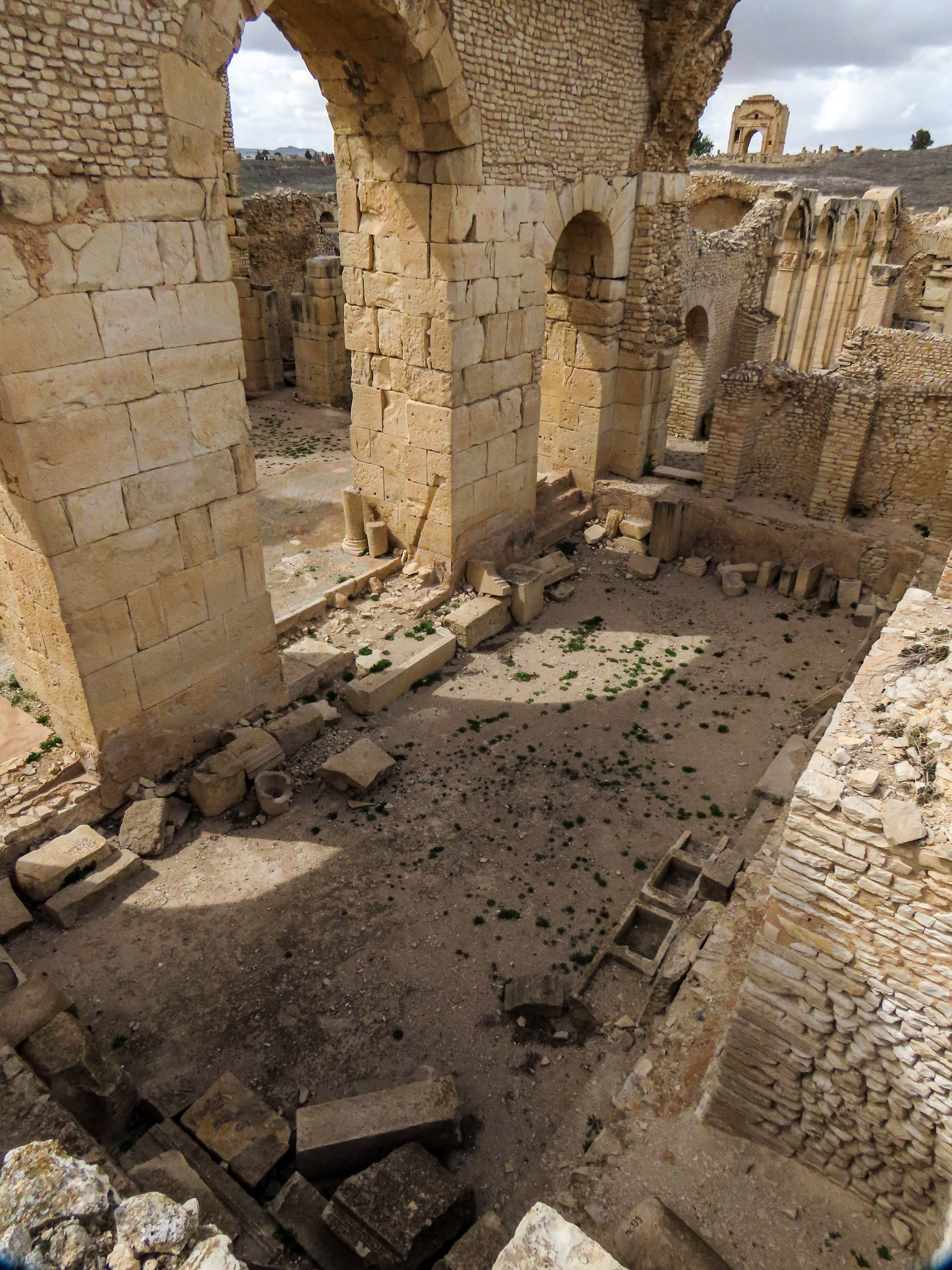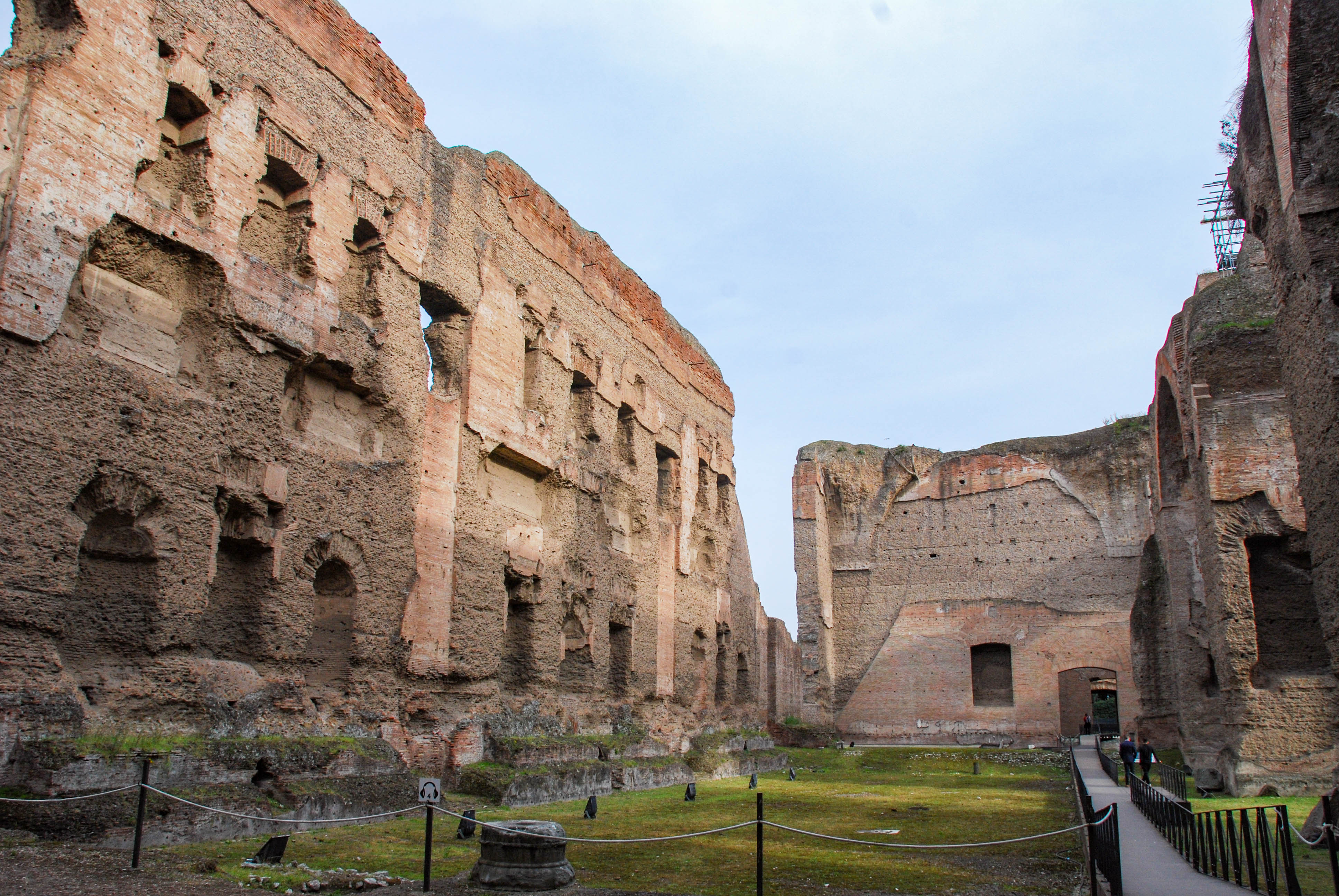 The natatio opening off the frigidarium of the Large East Baths of Mactar, Tunisia (L) and the natatio of the Baths of Caracalla in Rome (R) (photos Konogan Beaufay).
