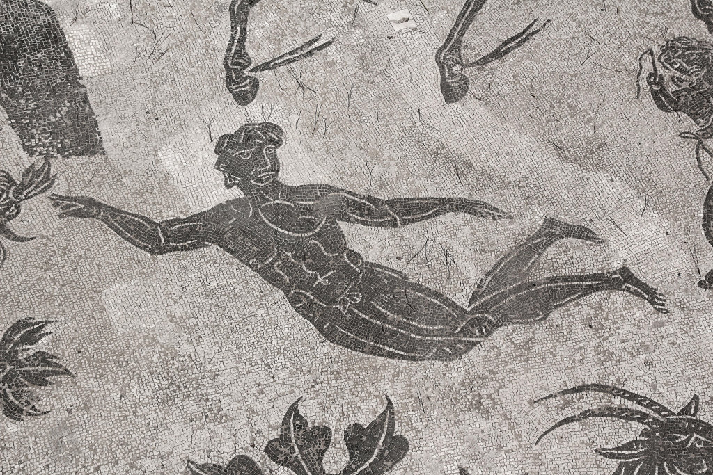R: black and white stone tesserae used to create a figurative scene in the mosaic technique, here on the floor of the vestibule of the Neptune Baths of Ostia (Klaus Heese, Ostia-antica.org).