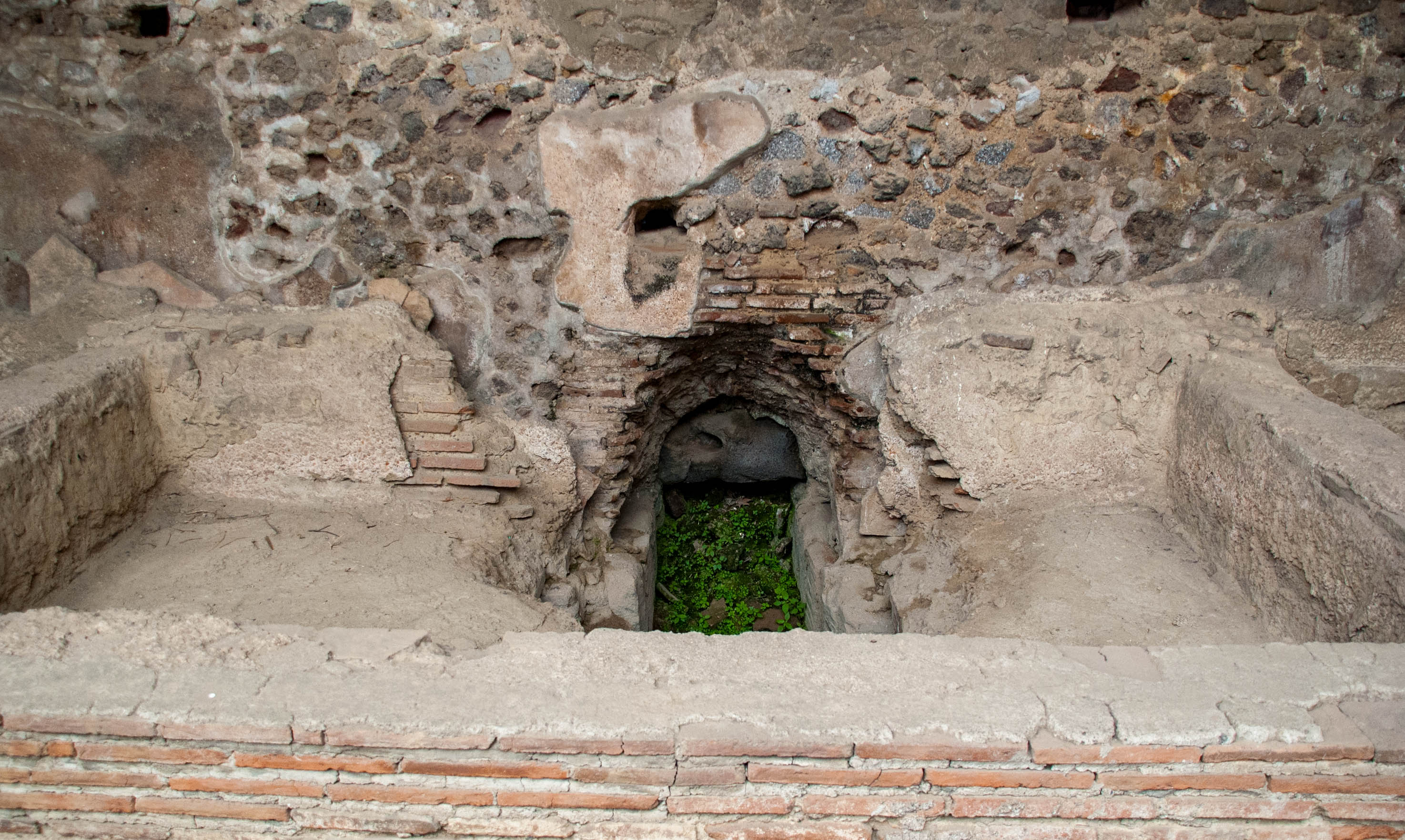 An alveus in the Stabian Baths of Pompeii that was originally equipped with a testudo. The fact that the intrados of the arch of the furnace is at a higher level than the floor of the alveus, as well as the cutting in the floor of the alveus around the furnace, are clear indicators that this pool was equipped with an testudo that was later robbed (photo Konogan Beaufay).